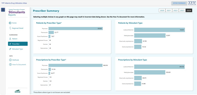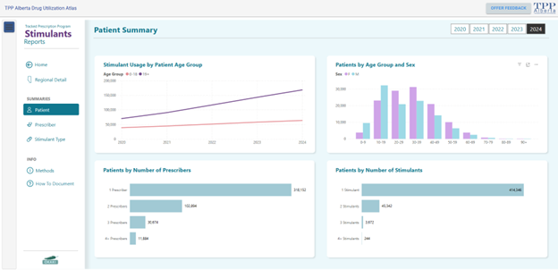 The TPP Atlas is a dynamic, publicly accessible online resource that provides detailed insights into prescription drug utilization in Alberta. The TPP Atlas data is updated annually and provides prescribing data to support ongoing monitoring and evidence-informed clinical practice. It focuses on medications with higher potential for misuse, utilizing community pharmacy dispensing data from the Alberta Netcare Pharmaceutical Information Network (PIN).