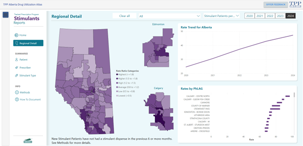 The Regional Detail dashboard highlights prescribing trends for Alberta and rates across different areas (Pharmacy Local Aggregate Geographies or PhLAGs) based on new stimulant patients and stimulant patients per 1000.